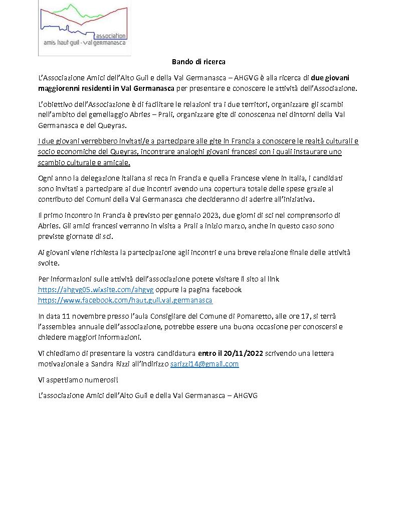 Descrizione L'Associazione Amici dell'Alto Guil e della Val Germanasca è alla ricerca di due giovani maggiorenni residenti in Val Germanasca per presentare e conoscere le attività dell'associazione.Scadenza candidatura: 20.11.2022