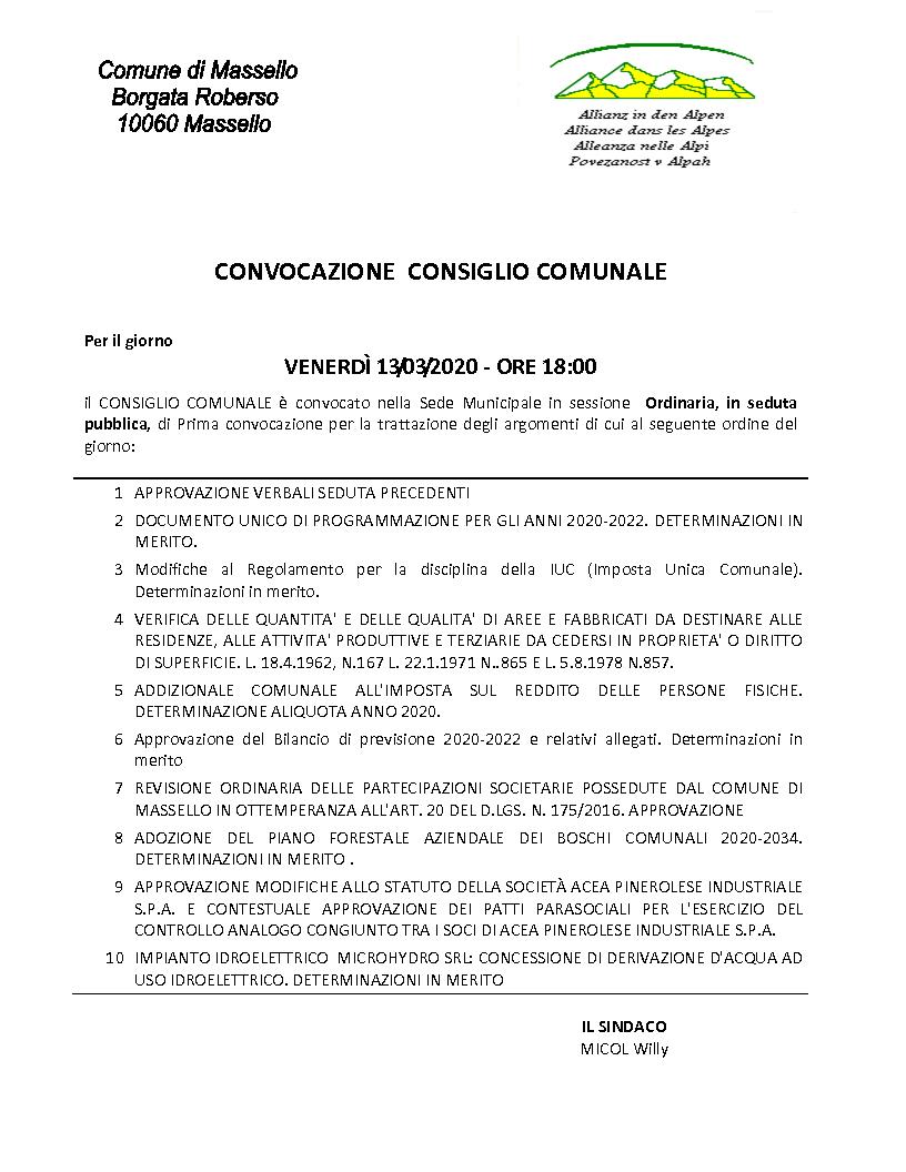 SCARICA IL MANIFESTO DELLA CONVOCAZIONE DEL CONSIGLIO COMUNALE PREVISTO PER IL 13/03/2020 ALLE ORE 1 ...