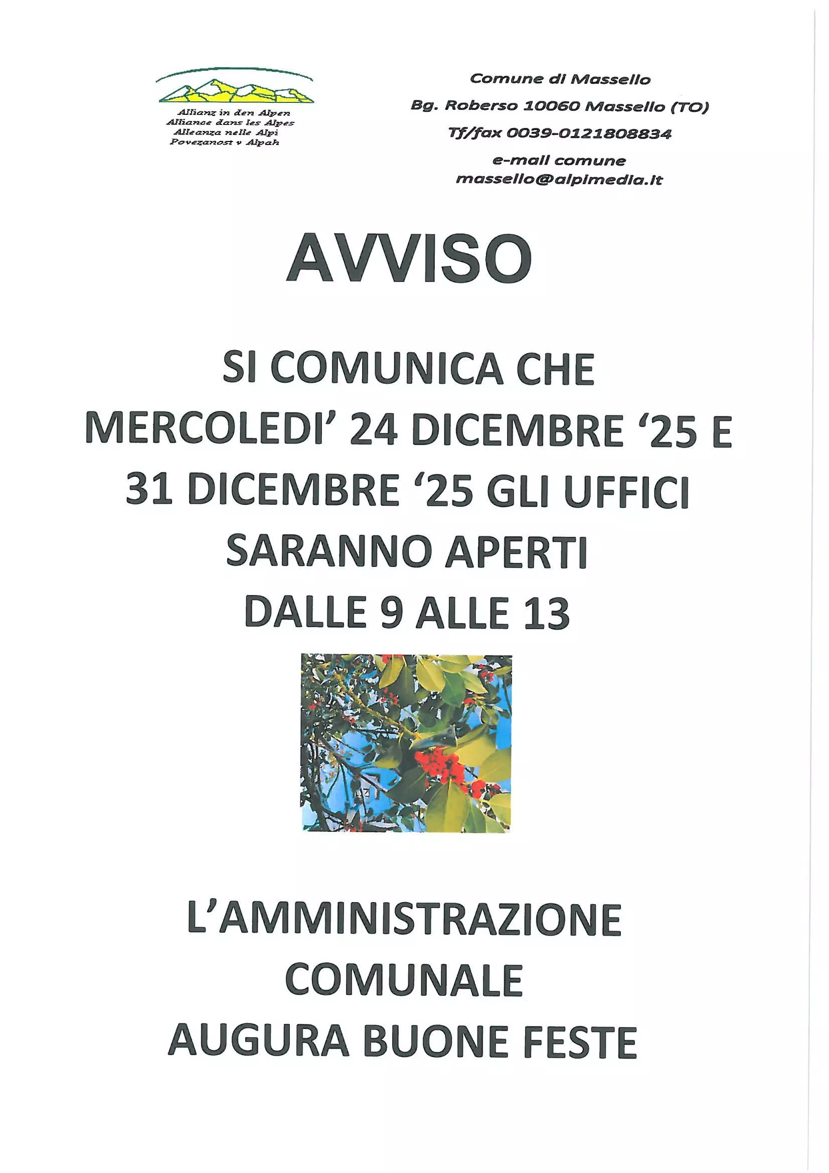 Descrizione SI COMUNICA CHE MERCOLEDI’ 24 DICEMBRE E 31 DICEMBRE ‘25 GLI UFFICI SARANNO APERTI DALLE 9 ALLE 13 L’AMMINISTRAZIONE COMUNALE AUGURA BUONE FESTE