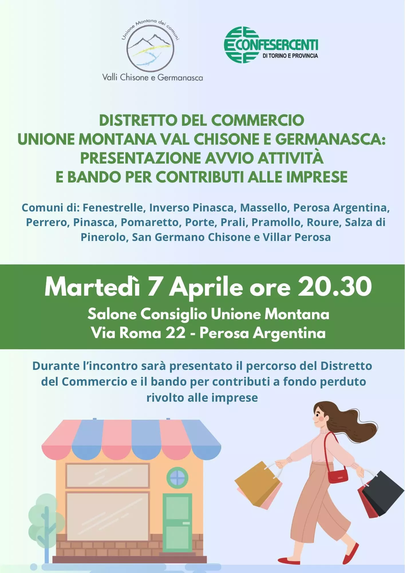 Descrizione Martedì 7 aprile alle ore 20:30 presso la sala consigliare dell'Unione Montana di via Roma 22 a Perosa verrà presentato il percorso del Distretto del commercio ed il bando per i contributi a fondo perduto rivolto alla imprese.